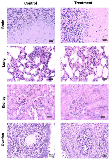 Tumors and the liver, spleen, kidney, lung, brain, and ovary from mice were fixed with 4% formaldehyde for 24 h at room temperature, embedded in paraffin, and sectioned in 4–5 μm-thick sections using a microtome. Paraffin sections of tumor samples were deparaffinized in xylene and rehydrated in a series of graded alcohols. Dewaxed tissue sections were stained with hematoxylin and eosin (H&E). Sections were evaluated using a light microscope (magnification of 400× and 1000×) (Zeiss; Mod. Axioscope: Oberkochen, Germany). Images were acquired with a digital camera (5MP high-speed color; AmScope; Mod. Mu500: Irvine, CA, USA).