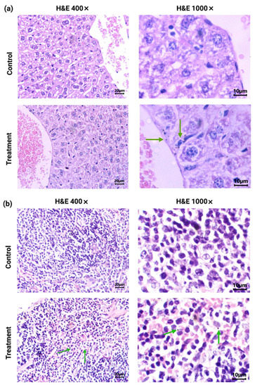 Histological analysis (H&E staining) (light micrographs): (a) representative sections at 400× and 1000× magnification of the liver from [177Lu]Lu−iFAP/iPSMA-treated and control mice; (b) representative sections at 400× and 1000× magnification of the spleen from [177Lu]Lu−iFAP/iPSMA-treated and control mice. Note the presence of nanoparticle clusters, especially within macrophages (green arrows).