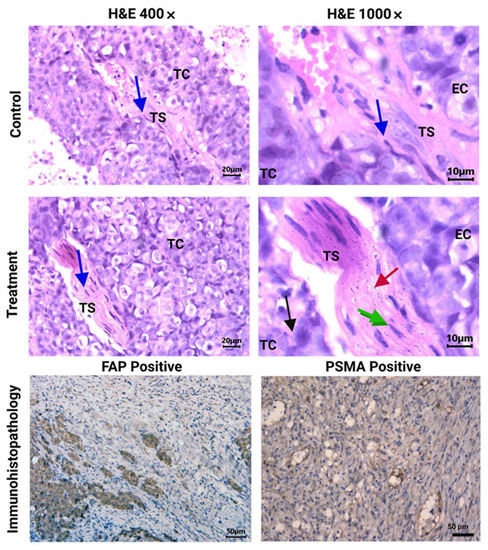 Histopathological analysis (H&E staining). Light micrographs of representative sections at 400× and 1000× magnification of HCT116 tumors from [177Lu]Lu−iFAP/iPSMA-treated and untreated (control) mice. Cancer-associated fibroblasts (CAFs) can be observed in the tumor stroma (TS) (blue arrow). Note nanoparticle clusters of [177Lu]Lu−iFAP/iPSMA in TS (red arrow), in CAFs (green arrow), and in tumor cells (TC) (black arrow), but not found in endothelial cells (EC). PSMA and FAP expression in HCT116 tumors (dark brown color) (200× magnification of) is also shown (immunohistopathology results).