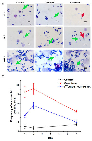 (a) Light micrographs (Giemsa-Wright staining at 1000× magnification of) of bone marrow cells from healthy mice at 24, 48, and 168 h after i.v. administration of [177Lu]Lu−iFAP/iPSMA nanoparticles (treatment), colchicine (1 mg/kg) (positive control), and untreated mice (negative control). Green arrows show polychromatic immature erythrocytes, and red arrows indicate polychromatic erythrocytes (PCE) with micronuclei. (b) Micronucleus count values in immature bone marrow erythrocytes at 1, 2, and 7 d. Data are presented as mean ± standard deviation of three independent experiments. Non-significant difference (p > 0.05) between control and treatment at 7 d.