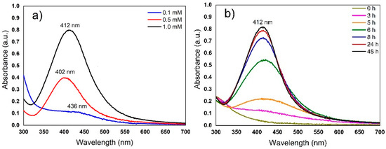The change to yellow-brown is characteristic and indicates the formation of AgNPs; this is due to surface plasmon resonance (SPR), which is a size-dependent property of NPs [30,40,41,42]. The formation of AgNPs was increased while increasing the concentration of AgNO3, i.e., the maximum SPR AgNPs was observed using 1 mM AgNO3 and a greater intensity and definition of absorbance spectra of SPR band was shown when compared with 0.1 or 0.5 mM AgNO3, as can be seen in Figure 2a.