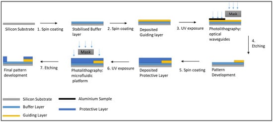 The fabrication process of the optofluidic platform is sketched in Figure 2. It involves the consecutive microstructuration of the optical waveguides (step 1 to 4) and the microfluidic counterpart (steps 5 to 7) on the same substrate.