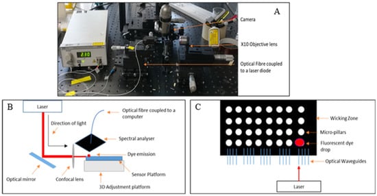 Atto 633 was deposited in the wicking zone of the platform and subsequently irradiated with a red laser line at 632.8 nm (Uniphase He/Ne laser) with an intensity of 0.1 mW. A schematic of the optical set up used is sketched in Figure 3B. The emission spectra were collected via a spectral analyser (Avantes AvaSpec-2048) (Avantes B.V, Apeldoorn, The Netherlands) with a broad band light source (AvaLight HAL-S) (Avantes B.V, Apeldoorn, The Netherlands) guided by a fibre optic cable (Avantes FC-UV400-2) (Avantes B.V, Apeldoorn, The Netherlands). A schematic of the sensor platform with the location of the fluorescent dye is sketched in Figure 3C. As the optical fluorescence set up was adapted to be used with optical waveguides, notch filter passes were not used for fluorescence detection.