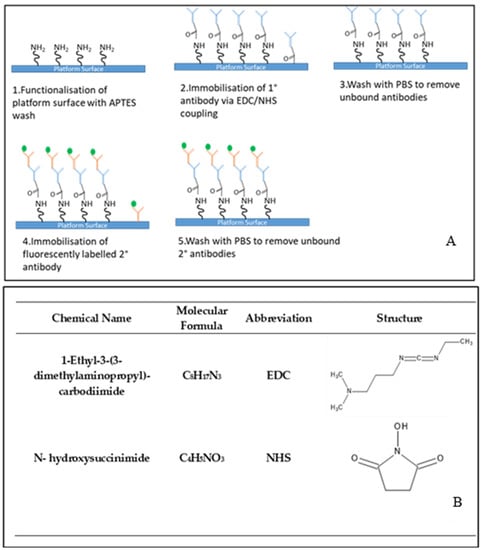 The bio-technology protocol was established to demonstrate the applicability of the developed optofluidic device as a sensing platform (Figure 4A). 1-Ethyl-3-(3-dimethylaminopropyl)-carbodiimide (EDC)/N-hydroxysuccinimide (NHS) coupling chemistry is used to bind the primary antibody to the functionalised surface of the sensor platform and is a widely used immobilisation strategy [46]. EDC is a water-soluble cross-linking agent which forms amide bonds between carbonyl and amine groups. As EDC is not fully stable in water, due to the oxygen atoms acting as nucleophiles and inactivating the EDC, NHS is used to improve its stability [47]. The structures of both compounds are shown in Figure 4B.