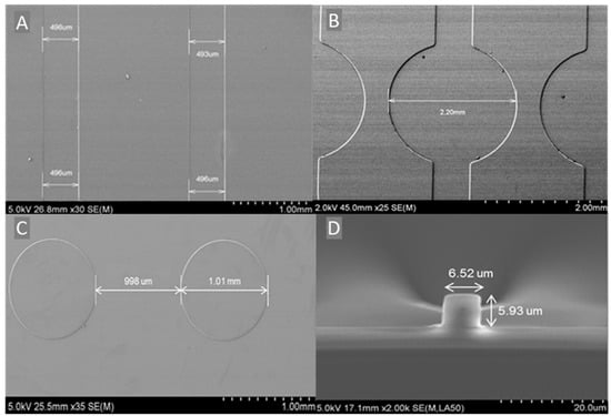 Figure 6A shows the SEM image of the MFCs with a width of 495 μm (±2 μm). The 5 μm difference to the employed photomask (500 μm) is attributed to the measurement error of the SEM, due to the difficulty to focus precisely on the edge of the MFCs. Nevertheless, this difference corresponds only to 1%, which confirms a good control of the established photolithography process. This is further confirmed by the linear shape of the MFCs. Figure 6B represents the SEM image of the sensor spots and their junction with the MFCs. Their good circular shape, with a diameter of 2.2 mm (matching the photomask size with a resolution of 10%) and their direct integration to the MFCs indicates that the fabrication process is adequate for the development not only of linear microstructures but also for microstructures of complex shapes. The pillars located in the wicking zone are shown in Figure 6C and are found to exhibit diameter of 1 mm and separated between each other by 1 mm, as expected from the photomask. Figure 6D shows the SEM images of the cross-section of the optical waveguide along with the buffer layer on the silicon wafer. From the cross-section view, it can be observed that the optical waveguides exhibit a quasi-squared profile with a section of 6 μm (±10%) and a buffer layer close to 4.5 μm.