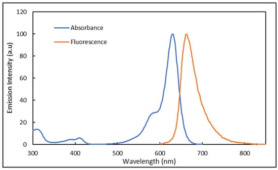 A UV-Vis absorption spectrum for an aqueous solution of Atto 633 was recorded on a Perkin Elmer Lambda 800 spectrometer (Perkin Elmer, Waltham, MA, USA). Fluorescence spectroscopy was also recorded for the dye and the emission spectrum was recorded using a Perkin Elmer LS 55 Luminescence Spectrometer (Perkin Elmer, Waltham, MA, USA). The excitation wavelength chosen was specific to the dye. Emission spectra were recorded between 650 and 900 nm with an excitation wavelength of 633 nm.