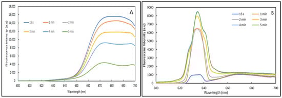 Emission spectra of Atto 633 dye at 0.1 mW at (A) 1.2 × 10−5 g/mL and (B) 1.2 × 10−6 g/mL.