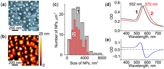 Characterization of the glass with Au NPs. (a) SEM and (b) AFM images. (c) NPs size distributions before (1) and after (2) cleaning of the glass surface. (d) Extinction spectra of the as-received (1) and cleaned (2) glass, (e) corresponding differential spectrum.