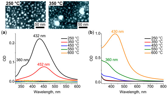 Figure 2a shows that heat treatment of the glass containing Ag+ ions at 250 °C leads to the emergence of two distinct resonances in the differential spectrum. One of the resonances is at 360 nm and the other is at 432 nm. When the temperature of the treatment increases to 350 °C the short-wavelength resonance vanishes from the spectrum, while long-wavelength resonance experiences the redshift by 20 nm, and its intensity decreases by a factor of 2. The SEM images of both (250 °C and 350 °C) heat-treated specimens (see inset in Figure 2a) demonstrate the presence of circularly shaped NPs ~10 nm in diameter. Larger NPs (~30 nm) could also be observed on the surface of the glass treated at 350 °C. For the temperatures of heat treatment above 350 °C, the differential spectrum has no resonances, while the bulk spectrum does (see Figure 2b). The resonance in the bulk spectrum shifts from 360 nm to 430 nm, and its intensity increases by tenfold as the treatment temperature rises from 450 °C to 600 °C. Note, the SEM images of the glasses treated at ≥450 °C do not show any NPs on the surface. We interpret the transformation of the spectra and SEM images as follows.
