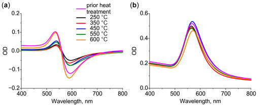 (a) Differential and (b) bulk spectra of glasses containing Au NPs after heat treatment in air at 250–600 °C.
