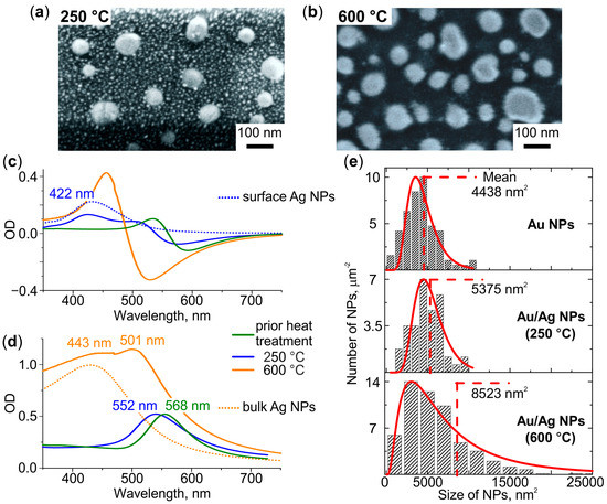 Comparison of the average size of Au/Ag NPs with the initial size of Au NPs allows for estimating the proportion of Ag in the alloy NPs. In particular, the lateral sizes of Au/Ag NPs formed after heat treatment at 250 °C and 600 °C are, on average, F = 1.1 and F = 1.4 times larger than the ones of Au NPs, respectively (see Figure 4e). The height of Au/Ag NPs increased in proportion to lateral sizes (see Figure S2 in Supplementary Material). Assuming that (i) the mass of gold in NPs, mAu, did not change in the course of the heat treatment, and (ii) the density of alloy is linearly related to its composition, the mass of silver in Au/Ag NPs, mAg, can be evaluated using the equation: