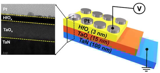 Cross-sectional TEM analysis and schematic of the Pt/HfO2/TaOx/TaN (PHTT3) device.