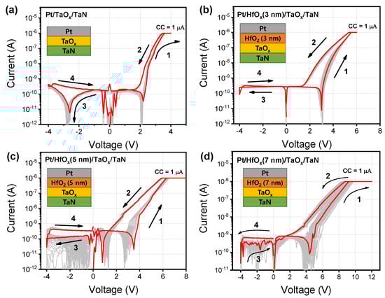 I–V characteristics of the threshold switching are shown in Figure 3a–d. Each I–V curve shows 100 cycles; the red line shows the 50th curve of positive TS property. A 0.05 V step per sweep and voltage sequence for returning to 0 V though Vset (4/6/8/12 V) and Vreset (−4 V) were given to each device in the condition of current compliance (ICC) of about 1 μA. The electroforming process was not shown in the TS characteristics due to the current limitation. Switching direction is marked with the numbers from 1 to 4 in Figure 3a, which shows the I–V curve of PTT and a small Vset of approximately 3.7 V. With increasing voltage from 0 V to 4 V, a set process that gradually switched from the high-resistance state (HRS) and low-resistance state (LRS) occurred. Interestingly, after going through a set process, it returned to the HRS even if the device did not experience the reset process. Nevertheless, the reason for the negative voltage was to keep the interval between the DC cycle and cycle constant. PHTT3 in Figure 3b has a Vset of about 4.5 V, which is greater than PTT. The Vset in Figure 3c,d increases gradually as the thickness of HfO2 becomes thicker and the non-uniformity of the I–V curve becomes severe. Among the four devices, PHTT3 shows the most uniform performance, a low Vset, and the high on–off ratio of ≈21. Thus, we decided to use PHTT3 for the realization of nociceptor function in further study.