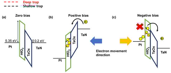 Figure 4 shows the band diagram schematic of the PHTT device. The conduction band offset of the top and bottom electrode with the insulating layer is shown. As a result of calculating the work function of each material from the zero bias in Figure 4a, the energy barrier between Pt and HfO2 is 5.35 eV, and between TaOx and TaN it is 0.2 eV [,,]. The detailed switching process can be described in the following description. The deep and shallow trap sites exist in the insulating layer of HfO2. When these traps are not filled with electrons, the device remains in the HRS. Figure 4b illustrates when a positive voltage is applied to the Pt top electrode so that the trap energy level becomes lower than the Fermi level of the TaN bottom electrode []. The trap sites in HfO2 gradually accumulate with electrons injected from TaN and the PHTT device begins to switch from HRS to LRS. Moreover, depending on the magnitude of ICC, it is possible to control the number of electrons being filled in the trap. When the externally applied voltage is removed, the energy band returns to its original state in the zero bias. Contrary to the previous state, the energy level in HfO2 is higher than the Fermi level in TaN, resulting in de-trapping in which electrons naturally flow to the TaN bottom electrode. Therefore, PHTT returns from LRS to HRS with the removal of positive voltage. Figure 4c shows the condition of the negative bias; electron de-trapping is further accelerated and blocks the electron injection through the Pt top electrode. Since the trap energy level rises, the de-trapping speed of electrons is also increased. PHTT5 and PHTT7 have thicker HfO2 than PHTT3, and a greater number of traps are located in the insulating layer. As confirmed in Figure 3, this may be the reason for the increase in the Vset value.