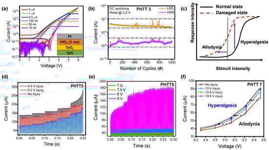 Figure 5a shows different TS behaviors at various ICC values. The PHTT3 device shows a large range of TS characteristics depending on ICC from a minimum of 10 nA to a maximum of 5 µA, showing that our device not only operated at a low ICC but was also driven at a high ICC. The endurance test with 1000 cycles was checked as shown in Figure 5b. Endurance was measured by applying a DC voltage of 6 V (SET), reading through a DC voltage of 3.5 V, applying a DC voltage of −4 V (RESET), and reading at 3.5 V. The resistance values were extracted from the read voltage of 3.5 V, and stable endurance was achieved compared to the previously reported work []. Next, we experimentally confirmed the characteristics of the nociceptors, called “allodynia” and “hyperalgesia”. Figure 5c schematically indicates the signal responses of the nociceptors in damaged and normal states, and “allodynia” and “hyperalgesia” behaviors are separated by the threshold value. After the injury, the nociceptor must show the enhanced response at a reduced threshold as presented by vertical and horizontal arrows. Figure 5d expresses the current response under the different voltages (pulse amplitude: 4.5 V~8.5 V/step: 1 V). The width of the pulse was fixed at 0.3 ms. First, a current of 75 µA flowed at a pulse amplitude of 4.5 V without damage. As the pulse amplitude increased, the output current reached a maximum of 150 µA. Second, the red line was damaged with a strong pulse of 9.2 V before pulse measurement, and then the current response was measured. The current raised from 120 µA to 170 µA as the voltage increased. Lastly, because of the strong injury (9.4 V pulse), the current increased rapidly by 10 pulses of 8.5 V amplitude. Similar results were derived through measurements in PHTT5 and PHTT7. As shown in Figure 5e, the voltage was applied from 7 V to 9 V to show the current responses. Figure 5f shows the behavior of “hyperalgesia” and “allodynia”; only the magnitude of the injured voltage is different from Figure 5d. The thickness of the insulating layer was thicker than that of the PHTT3, so a larger voltage was applied to give damage. Through Figure 5d–f, we confirmed that the device reduces the threshold of their external stimuli, generating a current response in previous harmless stimuli (called “allodynia”) and increasing their response to normally innocuous stimuli (called “hyperalgesia”). From these results, it can be suggested that the PHTT device is sufficient to use as the nociceptor characteristics.
