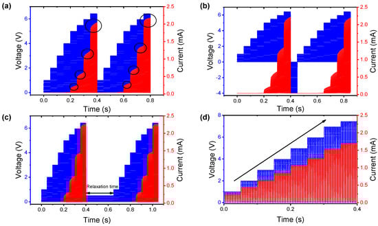 Current response with stair-shaped voltage in PTT. (a) Different amplitudes (1 V, 2 V, 3 V, 4 V, 5 V, 5.5 V, 6 V, and 6.5 V) are applied with a pulse width of 3 ms. (b) Negative voltage (−4 V) is applied between stepped pulses. (c) Sufficiently long relaxation time of 160 µs and 0.5 V amplitude is applied between stepped pulses so as to not affect the current response. (d) Voltage (1 V, 2 V, 3 V, 4 V, 5 V, 6 V, 7 V, and 7.5 V) is applied in PTT that does not function as a nociceptor memristor.