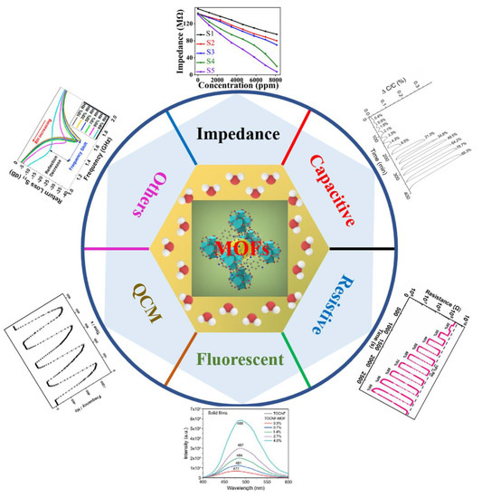 MOF−based electrically transduced humidity sensors, fluorescent−type humidity sensors, and QCM−type humidity sensors are able to detect humidity in most application scenarios. In addition, the MOF−based humidity sensors used in some special conditions still need to be researched (for example, environments with flammable and explosive substances). There are several types of MOF−based humidity sensors that can be used in special scenarios (Table 6).