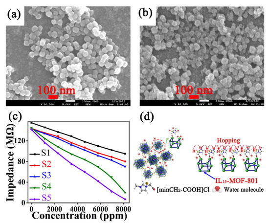In the abovementioned humidity sensors, the sensing films were mainly composed of MOFs powders; however, the poor film formability of MOF powders hinders the transmission of electrical signals and limits the improvement of the sensing performance. A high−quality sensing film is beneficial to the conversion and transmission of electrical signals. In order to obtain high−quality sensing film, it is necessary to control the particle size of the MOFs to the nanoscale. Cui et al. [83] synthesized Zn2+−modified UiO−66−NH2 with a particle size of ~200 nm, and the sensing film was prepared by drop coating. The humidity sensor with stable sensing film showed a high response (8070), a small hysteresis (1.81% RH), and a short response time (2 s). Wu et al. [84] prepared ILx−MOF−801 nanoparticles and the particle size was controlled to ~60 nm (Figure 6a,b). The sensing films were prepared by drop coating. MOF−801 is hydrophilic, and the introduced IL further enhanced the hydrophilicity and conductivity of MOF−801 (Figure 6c,d), so that the optimized ILx−MOF−801 sensor showed high sensitivity to low humidity (0–35% RH, 0–8138 ppmv), with a small hysteresis (1% RH), a fast response (400 ms), a high resolution (1% RH), and excellent long−term stability (>100 days).