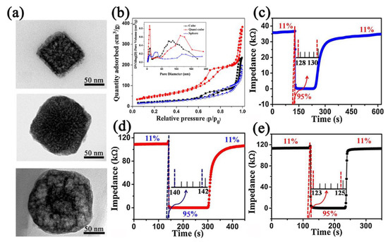 (a) TEM images of PB−derived Fe2O3 nanostructures with different morphologies. (b) N2 adsorption−desorption isotherms and corresponding pore size of different morphologies of Fe2O3 nanostructures. Response and recovery curves of different morphologies of Fe2O3−based humidity sensors between 11% RH and 95% RH (c) cubes, (d) quasi−cubes, and (e) spheres. Reproduced with permission from Ref. [88]. Copyright 2019, Elsevier.