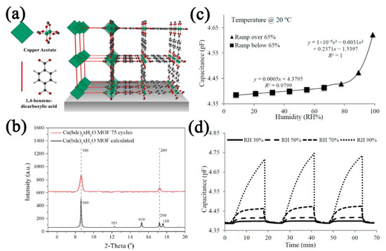 (a) Crystal structure, copper acetate, and organic linker of 2D Cu(bdc)·xH2O film. (b) XRD patterns of Cu(bdc)·xH2O film after 75 cycles and simulated. (c) Response curve of Cu(bdc)·xH2O−based sensor to humidity in the range of 11–100% RH. (d) Cycling curves of Cu(bdc)·xH2O−based sensor. Reproduced with permission from Ref. [95]. Copyright 1996–2022, MDPI, Basel, Switzerland.