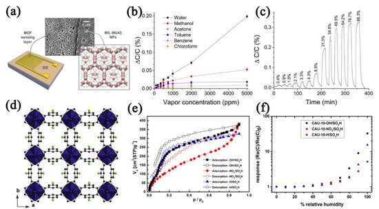 Al−based MOFs, for example, MIL−96 and CAU−10, are well known for their high stability and strong hydrophilicity, and thus can be used in capacitive−type humidity sensors. Andrés [54] and Rauf [97] prepared MIL−96(Al)−based humidity sensors on IDE electrodes (Figure 10a) and textiles using the Langmuir−Blodgett (LB) method. The MIL−96(Al) IDE sensor showed high selectivity and the LOD reached 0.21% RH (Figure 10b,c). Weiss et al. [98,99] prepared CAU−10−X(Al) with different functional groups (X: −NO2, −SO3H, −OH, etc.) to research the effect of functional groups on the performance of MOF−based capacitive−type humidity sensors (Figure 10d). At a low water pressure (0–0.05 P/P0), MOFs with different groups showed a similar water−adsorbing capacity, and MOFs with high hydrophilic groups (−SO3H, −OH) exhibited a stronger water−adsorbing capacity under high water pressure (0.1–0.2 P/P0) (Figure 10e). The pore−filling pressure was closely linked to the pore size, and the introduction of the hydrophilic group (−SO3H) changed the pore size and water adsorption affinity of CAU−10, leading to stronger adsorbate−adsorbent interactions in low humidity. Thus, the capacitance changes of the CAU−10−X(Al)−based humidity sensors were caused by the changes in dielectric permittivity (Figure 10f).