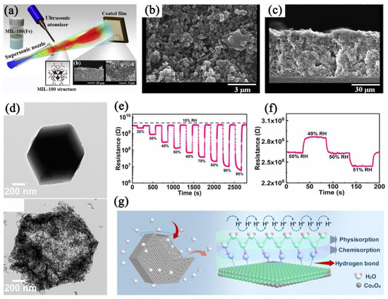 (a) Schematic illustration of cold−spray process showing the deposition of MIL−100 film. (b) Enlarged surface morphology and (c) cross−section of the prepared MIL−100 film. Reproduced with permission from Ref. [105]. Copyright 2017, Elsevier. (d) TEM images of ZIF−67− and ZIF−67−derived Co3O4. (e) Response curve of Co3O4−based humidity sensor to humidity in the range of 10–95% RH. (f) Response curve of Co3O4−based humidity sensor to 1% RH change. (g) Schematic diagram of continuous water films and proton conduction on the surface of Co3O4. Reproduced with permission from Ref. [55]. Copyright 2022, Elsevier.