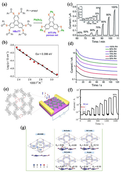 (a) Scheme of the synthesis of HTT−Pb framework. (b) Calculation of the activation energy of HTT−Pb. (c) Response curve of HTT−Pb−based sensor to humidity in the range of 5–100% RH. (d) Curves of current vs. time of the HTT−Pb−based sensor at various RH obtained by the DC reverse polarity method. Reproduced with permission from Ref. [109]. Copyright 2017, The Royal Society of Chemistry. (e) Crystal structure of the missing−linker amorphous aNi−HAB− and aNi−HAB−based sensor. (f) Response curve of aNi−HAB−based sensor to humidity in the range of 0–90% RH. (g) Side and top views of a slab model of aNi−HAB with possible H2O adsorption sites: purple, gray, blue, red, and white balls correspond to Ni, C, N, O, and H atoms, respectively. Reproduced with permission from Ref. [111]. Copyright 2021, American Chemical Society.