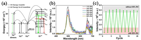 (a) Schematic energy−level diagram of Y/Yb/Er−MOF with the possible energy transfer paths. (b) Luminescent spectra (λex = 980 nm, 1.5 W) of Y/Yb/Er−MOF−based sensor to humidity in the range of 11–95% RH. (c) Cycling stability of Y/Yb/Er−MOF−based sensor. Reproduced with permission from Ref. [129]. Copyright 1996–2022, MDPI, Basel, Switzerland.