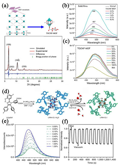 MOFs that combine O−donor or N−donor ligands and transition metals that own d10 configurations (Zn, Cu, etc.) exhibit appealing structures as well as photoluminescence properties. Wang et al. [130] reported a luminescent MOF [Zn(dpe)(bdc)]·4H2O (dpe = 1,2−bis(4−pyridyl)ethane, bdc2− = dianion of benzenedicarboxylic acid) with a unique 2D water layer. The emission peak and intensity of the MOF changed with the humidity. Tan et al. [56] reported aggregation−induced−emission luminogen (AIEgen) MOF nanosheets and TOCNF−MOF film−based humidity sensors (Figure 15a). Since the water molecules inhibited the motion of the TPE rotor in AIEgen, more energy was released in the form of fluorescent radiation. The fluorescence intensity of AIEgen MOF nanosheets was enhanced with the increased humidity. Cellulose nanofibril (CNF) is hygroscopic and swells after absorbing water molecules; the swollen CNF could change the nanosheet spacing and reduce the fluorescence intensity. The TOCNF−MOF−based humidity sensor showed fluorescent quench in the humidity range of 0–100% RH (Figure 15b,c). Chen et al. [131] reported a robust microporous MOF Zn(hpi2cf)(DMF)(H2O) (H2hpi2cf=5−(2− (5−fluoro−2−hydroxyphenyl)−4,5−bis(4−fluorophenyl)−1H−imidazol−1−yl)isophthalic acid). MOFs undergo single crystal−to−single crystal (SC−SC) transition upon dehydration because of the change in the fine arrangement of Zn−O clusters, and the fluorescence properties are changed (Figure 15d). The MOF−based fluorescent sensor exhibited an intensity increase when the water concentration increased, and the LOD was as low as 1% RH with good cycle characteristics (Figure 15e,f). Fluorescent MOFs with main metals also have the potential for water detection. Douvali et al. [132] reported a 3D open−skeleton MOF (Mg(H2dhtp)(H2O)2)⋅DMAc with structure breathing ability. The host−guest interaction between the water molecules and the MOF framework activates the fluorescence intensity, realizing the detection of extremely low water concentrations in organic solvents. The detection range was calculated to be 0.05–5% v/v.