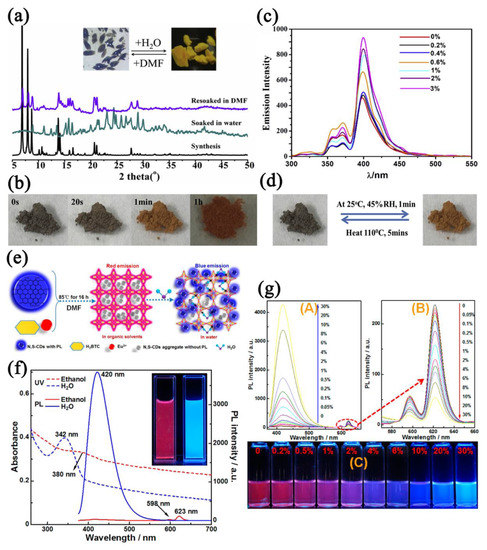The ratiometric detection of water by fluorescent MOFs is also attractive. It is known that water molecules affect the charge transfer process (LLCT, LMCT, MLCT) of MOFs during photoluminescence. The introduction of color−changing functional groups, encapsulation of guests, and introduction of multiple emission centers in MOFs may be beneficial to the ratiometric detection of water. Drache et al. [133] reported a Zr−MOF DUT−122 introduced with solution−chromic functional groups. The hydrogen bonds between the water molecules and the functional groups induced vibrational coupling, leading to non−radiative transitions that affect the luminescence of MOF. The DUT−122−based sensor exhibited increased fluorescence intensity in the humidity range of 0–100% RH. Qin et al. [134] prepared a naphthalenediimide−based Co−MOF {[Co2(DPNDI)(2,6−NDC)2]·7(DMF)}n. The reaction between the DPNDI group and water molecules affected the electronic transfer in the MOF, resulting in solvatochromism (Figure 16a). The Co−MOF−based sensor showed increased fluorescence intensity in the water concentration range of 0–3% v/v and was visible to the naked eye. In addition, the fluorescence intensity and crystal color of the sensor were time−dependent (Figure 16b–d).