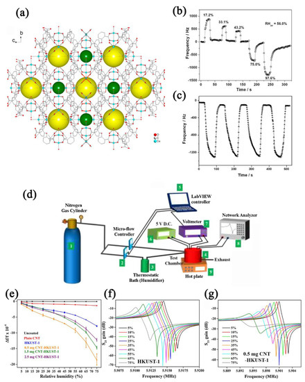 Copper−based MOFs attract wide attention for QCM−type humidity sensors. Zhou et al. [57] reported a QCM humidity sensor based on a copper MOF [Cu3L2(H2O)2.75]·0.75H2O·1.75DMA (Figure 18a). The sensor showed a 4162 Hz of frequency shift to humidity change from 17.2% RH to 97.6% RH with a sensitivity of 28.7 Hz/% RH (Figure 18b), and the corresponding response time and recovery time were calculated to be 30 s and 18 s, respectively (Figure 18c). Kosuru et al. [143] fabricated QCM humidity sensors by dripping PVP and HKUST−1 onto QCM elements, respectively. The QCM element, PVP QCM sensor, and HKUST−1 QCM sensor showed different responses (7 Hz, 48 Hz, and 720 Hz, respectively) in the humidity range of 22–68% RH. Through theoretical calculation, it was found that the porosity, hydrophilicity, and large adsorption energy endowed the HKUST−1 QCM with sensor better sensing properties. Chappanda et al. [144] researched the humidity−sensing performance of CNT−HKUST−1−based QCM sensors (CNT: carbon nanotube, Figure 18d). The CNT affected the nucleation of HKUST−1, resulting in a larger surface area of HKUST−1. The sensitivity of the CNT−HKUST−1 QCM sensor reached 141 Hz/% RH in the humidity range of 5–75% RH (Figure 18e–g), with a hysteresis of 5% RH and excellent long−term stability (>10 days).