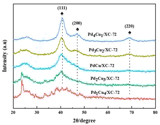 Moreover, we used the microwave digestion technique combined with inductively coupled plasma optical emission spectrometry (ICP-OES) analysis. Table 1 shows that the Pd metal content of Pd1Cu4/XC-72, Pd2Cu3/XC-72, PdCu/XC-72, Pd3Cu2/XC-72, and Pd4Cu1/XC-72 is 7.6, 12.4, 18.2, 19.7, and 25.8 wt%, respectively. In addition, the Cu metal content of Pd1Cu4/XC-72, Pd2Cu3/XC-72, PdCu/XC-72, Pd3Cu2/XC-72, and Pd4Cu1/XC-72 is 15.4, 11.1, 10.2, 6.9, and 3.5 wt%, respectively. This generally agrees with the ratio of PdCu alloy in our experimental design.