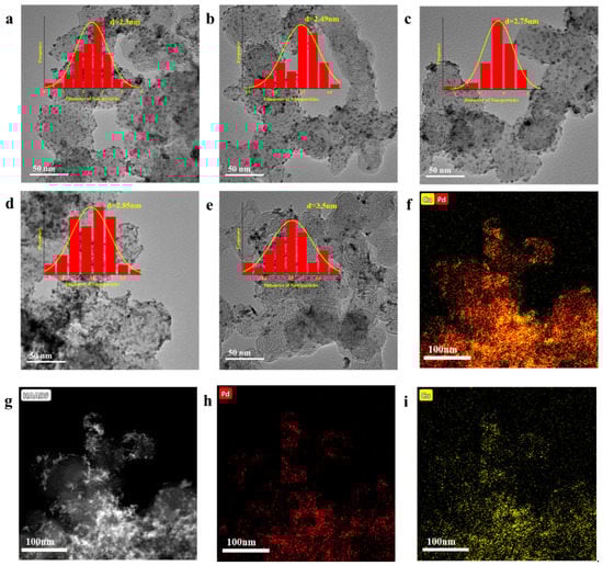 TEM Micrographs of PdxCuy/XC-72 (a) Pd1Cu4/XC-72 (2.3 ± 1 nm), (b) Pd2Cu3/XC-72 (2.49 ± 1 nm), (c) PdCu/XC-72 (2.75 ± 1 nm), (d) Pd3Cu2/XC-72 (2.85 ± 2 nm), and (e) Pd4Cu1/XC-72 (3.5 ± 1 nm). (f–i) EDX element maps of Pd3Cu2/XC-72.