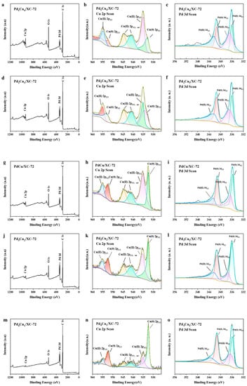 XPS data showing the wide spectra of (a–c) Pd1Cu4/XC-72 wide spectra, Cu 2p, and Pd 3d; (d–f) Pd2Cu3/XC-72 wide spectra, Cu 2p, and Pd 3d; (g–i) PdCu/XC-72 wide spectra, Cu 2p, and Pd 3d; (j–l) Pd3Cu2/XC-72 wide spectra, Cu 2p, and Pd 3d; (m–o) Pd4Cu1/XC-72 wide spectra, Cu 2p, and Pd 3d.