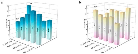 (a) The corresponding Pd0 and Pdn+ contents of Pd1Cu4/XC-72, Pd2Cu3/XC-72, PdCu/XC-72, Pd3Cu2/XC-72, and Pd4Cu1/XC-72, as well as (b) the corresponding Cu0 and Cun+ contents of Pd1Cu4/XC-72, Pd2Cu3/XC-72, PdCu/XC-72, Pd3Cu2/XC-72, and Pd4Cu1/XC-72.
