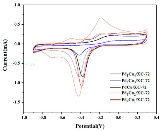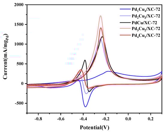 As is summarized in Figure 6, the electrochemical performance of the five electrocatalysts is shown. Cyclic voltammetry (CV) was performed on each of the Pd1Cu4/XC-72, Pd2Cu3/XC-72, PdCu/XC-72, Pd3Cu2/XC-72, and Pd4Cu1/XC-72 electrodes in N2-saturated 1.0 M KOH and 1.0 M CH3OH. It can be seen that there are obvious differences in electrocatalytic activities with different amounts of Cu. The results depict that Pd3Cu2/XC-72, the maximum value, was obtained (1719 mA·mg−1 Pd). Therefore, combined with XPS (Figure 4) and XRD (Figure 1) data, we can conclude that Pd3Cu2/XC-72 exhibits excellent catalytic performance due to its excellent electronic structure. In addition, it was found that the performance of the catalyst synthesized in this work was much higher than that of the catalysts synthesized in other works (Table 2).