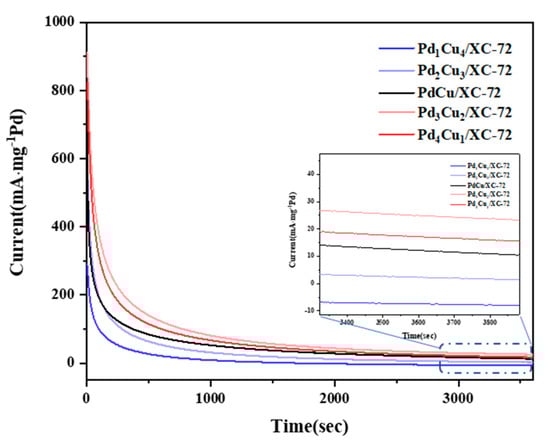 Chronoamperometry (CA) curves are recorded in 1.0 M CH3OH + 1.0 M KOH solution under a constant potential of −0.2 V, as shown in Figure 8. The high initial current density is caused by double-layer charging and abundant active sites for methanol activation. The current density dropped quickly within the first dozens of seconds due to the adsorption of CO produced from the MOR on the catalytic surface.