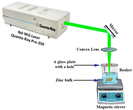 Several physical and chemical approaches, including solgel [29], thermal plasma [30], hydrothermal methods [31], and pulsed laser ablation in liquids (PLAL) [32], have recently been investigated for the liquid-phase synthesis of ZnONPs. PLAL is one of the most important physical approaches for producing NPs from their bulk form. When compared with other methods for obtaining metal colloids, PLAL is advantageous due to its ability to create high-purity nanomaterials using a simpler, faster, and direct methodology that does not require many steps or long process times [33]. It gives a smaller NP size with a narrower size distribution as compared with other conventional techniques [34]. Furthermore, PLAL is a flexible and environmentally friendly approach that enables the synthesis of a wide range of NPs without the use of any toxic or hazardous substances [32,35]. In PLAL, the high-intensity laser light is targeted on the surface of the solid target immersed in liquid. The sizes and shapes of the nanoparticles created by PLAL can be controlled by adjusting the laser beam’s parameters [36]. It is a one-step process that can result in ready-to-use batches without the need for additional sorting procedures [37].