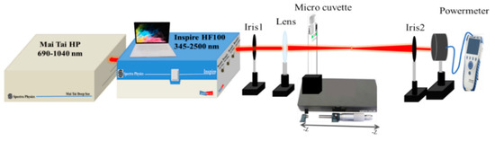 The setup of the Z-scan technique is shown in Figure 2 [54]. The femtosecond laser pulses were delivered by the INSPIRE HF100 laser system from Spectra-Physics, which was pumped by a mode-locked femtosecond Ti: sapphire MAI TAI HP laser, with ~1.5–2.9 W average power, 80 MHz repetition rate, and wavelengths ranging from 690 to 1040 nm.