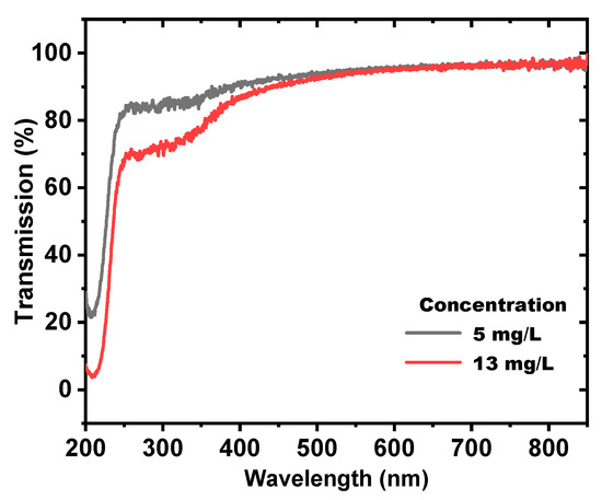The concentration of the prepared ZnONPs colloids was measured by atomic absorption spectrometry (AAS) (Agilent Technologies 200 Series AA). The AAS device worked because each ion or atom absorbed a specific wavelength, and the amount of light absorbed at this wavelength was exactly proportional to the concentration of the substance, which was determined using the Beer–Lambert law. In the AAS, the concentration is normally calculated using a calibration curve obtained with known concentration standards [55]. The concentration of ZnONPs colloids was increased from 5 to 13 mg/L by increasing the ablation time from 5 to 10 min. That also showed that as the ablation time increases, the ablation efficiency improves. The optical transmittance of the ZnONPs colloids was measured in a wavelength range of 200–850 nm by using the UV-Vis–NIR spectrophotometer (Perkin-Elmer, Lambda 950 spectrometer), as shown in Figure 3.