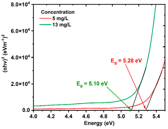 where α is the linear absorption coefficient, hν is the energy of the photons, A is an energy-independent constant, and Eɡ is the bandgap energy. Using Tauc’s equation, the bandgaps of the ZnONPs colloids were found to be 5.28 and 5.10 eV for concentrations of 5 and 13 mg/L, respectively, as shown in Figure 4.