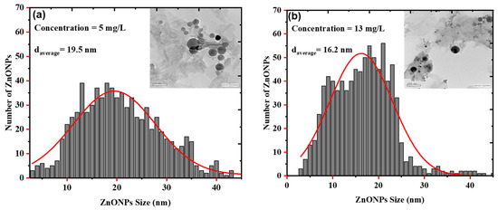 Figure 5a,b shows the TEM images and size-distribution graph histograms of the colloidal ZnONPs colloids at the different concentrations of 5 and 13 mg/L, respectively. The ablation laser fluence was kept constant at 28.29 J/cm2, and the ZnONPs colloids had a spherical morphology. The average sizes of the ZnONPs colloids at concentrations of 5 and 13 mg/L were 19.5, and 16.2 nm, respectively. Due to the photo-fragmentation process being more effective with longer ablation times compared with bulk thermal ablation, the average sample size of 13 mg/L decreased as the ablation time was increased from 5 to 10 min. This observation would be clarified with a description of the physics that goes beyond PLAL’s production of nanoparticles. The PLAL is a straightforward thermal effect that involves heating, melting, vaporizing, and ionizing the target material to produce plasma, from which the matter is expelled [57,58]. However, in the present work, the irradiation of the bulk zinc is more related to the photo-fragmentation of the ablated nanoparticles that accumulate close to the laser spot. Once the amount of created nanoparticles becomes sufficiently enormous, they shield the incident laser’s light. Hence, the incident laser energy reaching the zinc bulk is attenuated, which causes no further increase in the number of nanoparticles. As a result, rather than removing material from the zinc bulk, most of the laser’s energy is used to break up the larger ablated particles into smaller ones [59]. Figure 5b, which depicts this finding, demonstrates how the number of nanoparticles with small sizes increases while the number of nanoparticles with large sizes decreases after a 10-min ablation time. The bandgap of ZnONP colloids decreases from 5.28 to 5.1 eV with decreasing size from 19.5 to 16.2 eV, which disagrees with the theory of electron confinement at the nanoscopic scale [60,61,62]. This theory is only applicable to nanoparticles in the quantum range that are between 1 and 10 nm in size, and is not applicable to particles larger than 10 nm, as shown in Figure 4 and Figure 5.