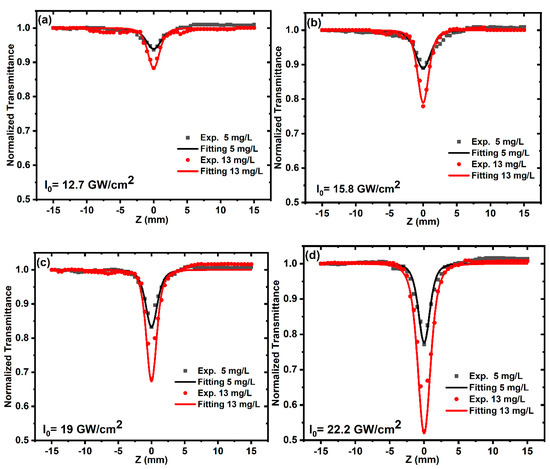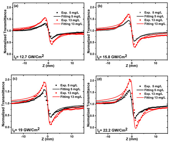 where f (0) is the focal length of the induced thermal lens when the sample is placed at the focus (Z = 0). The CA Z-scan studies were performed for the 5 and 13 mg/L samples of ZnONPs colloids; the samples were irradiated by an excitation wavelength of 800 nm and different incident peak intensities ranging from 12.7 to 22.2 GW/cm2. The closed aperture was adjusted to transmit a fixed fraction of 30% from the total transmitted light in the OA, and the results are shown in Figure 10a–d. The experimental data was fitted to the expression given by Equation (4). In Figure 10, the transmission exhibits a pre-focal peak, followed by a post-focal valley. This reveals that ZnONPs colloids exhibit a negative nonlinear refractive index that is induced by the self-defocusing property of the ZnONPs colloids, which agrees with the previous reports [51,63].