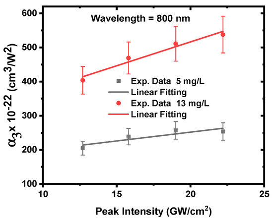 Figure 7 shows how is affected by the incident laser peak intensity. increases with an increasing incident laser peak intensity. This is because increasing the laser intensity increases the number of excited electrons in the conduction band (3PA), which thus increases the probability of free-carrier absorption [64]. It is also noticeable that the of 13 mg/L is higher than that of 5 mg/L, reaching 289 × 10−22 cm3/W2 and 497 × 10−22 cm3/W2, respectively. This is because increasing the concentration of ZnONPs colloids from 5 to 13 mg/L increases the number of nanoparticles in the solution, which increases the amount of three-photon absorption [54]. According to the previous report [51], the obtained 3PA coefficient is three times larger than that of thin film, and eight times larger than that of bulk zinc.