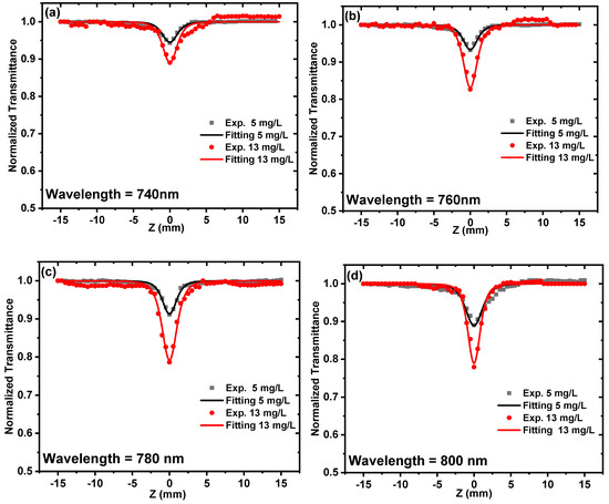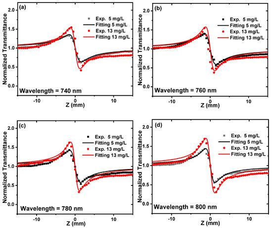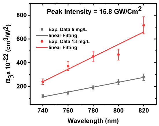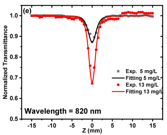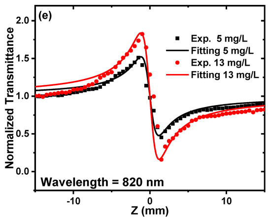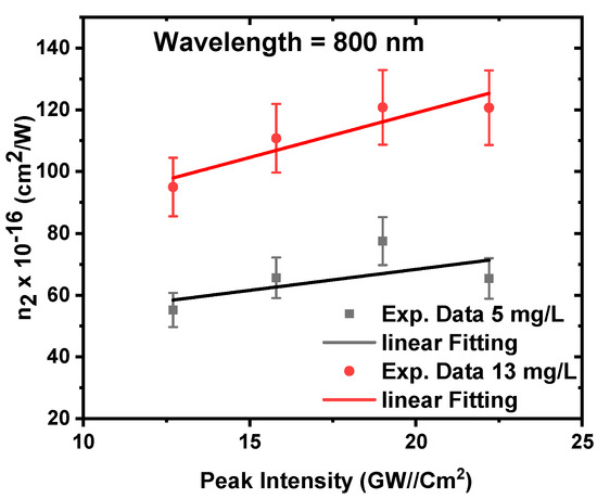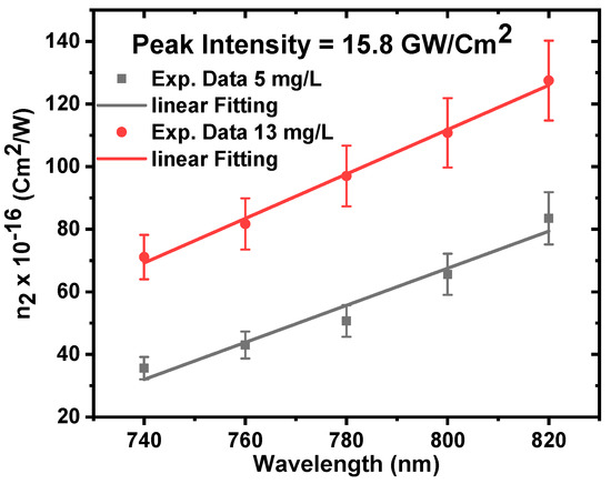 Figure 13 shows a linear dependence of the nonlinear refractive index on the excitation wavelength. As the wavelength increases from 740 to 820 nm, the nonlinear refractive index n2 increases from 35 × 10−16 cm2/W to 83 × 10−16 cm2/W for 5 mg/L, and increases from 71 × 10−16 cm2/W to 127 × 10−16 cm2/W for 13 mg/L. This is because the increase in wavelength is accompanied by an increase in nonlinear absorption; as previously stated, nonlinear refraction is caused by absorptive processes.