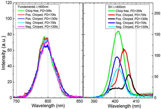 Figure 2 shows the spectra of 800 nm and 400 nm PP at variable chirps. As expected, despite the redistribution of the red and blue components, the spectrum of fundamental PP does not change (left panel of Figure 2). But in the case of the SH generated by chirp-free and chirped pulses, we observed the spectral shifts toward the corresponding chirp sign—relatively large redshift for positively chirped pulses and relatively small blue shift for negatively chirped pulses (right panel of Figure 2). The additional difference in the spectral shapes of 400 nm pulses can be explained by the changes in the optimal phase-matching conditions since the optimal orientation of BBO crystal was adjusted for the chirp-free pulse and then kept the same for the chirped pulses.