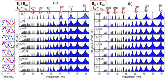 Figure 6 shows the results of HHG calculation where the values of Ip and Iω correspond to the experimental results of SiC LIP presented in Figure 7. The ionization potential Ip was deduced for Iω = 1.65 × 1014 W/cm2 and the cut-off position from Figure 5a corresponded to Ip = 9 eV. Figure 6 presents the calculations using Equation (1) in the case of equal intensities of ω and 2ω fields (Iω = I2ω) while their polarizations were orthogonal or parallel to each other. For simplicity, Eω is always oriented along the x-axis, while E2ω is oriented along either x-axis or y-axis. For comparison, the 800 nm pump is presented with top row HHG spectra (Figure 6, SCP). Harmonic spectra with different phase shifts φ0 are presented between 0 and π with a π/6 step. The corresponding profiles of ω and 2ω fields are shown in the first column of Figure 6 with red and blue solid lines in a time range of single period for fundamental field.