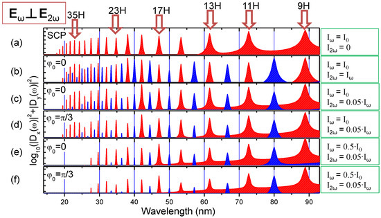 Calculated HHG spectra for PTC with Ip = 21.5 eV were empirically determined through Equation (3) for Cr3C2 LIP. Panel (a) shows the calculated spectrum of harmonics in the case of single-color pump. Through panels (b–f), different relations between Iω, I2ω, and φ0 were considered. Here I0 = 1.65 × 1014 W/cm2. SCP row presents the calculated HHG with only 800 nm field.