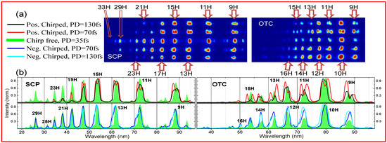 Together with cutoff scaling, the chirped PPs led to observable spectral effects [30,31,32]. Combined with OTC, the application of chirped PPs sufficiently enriched the observed HHG spectra.