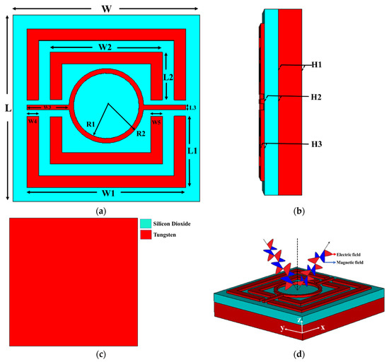 The proposed unit cell has a split ring resonator (SRR) and circular ring resonator (CRR) on top of dielectric material. The backside layer is fully blocked with a dielectric material. Tungsten serves as the metal, and silicon dioxide (SiO2) is chosen for the dielectric. The scattering condition, band structure, and optical characteristic of silicon dioxide (SiO2) and tungsten (W) are detailed in this article by G. Ghosh [27,28]. Tungsten is significantly more stable for applications involving a wide frequency band in the optical range, when compared to other commonly used metals in MA. The superior impedance matching characteristics that tungsten possesses in the optical range are the primary reason for selecting it as the material to be used in the resonator layer, which reduces transmission and reflection. The loss-free feature silicon dioxide (SiO2) is chosen for the dielectric layer. Tungsten shows flexible absorptivity inside the optical region, and resonance properties help to design impedance matches. Optical wavelengths are essentially lossless; therefore, they ignore absorption. As a result, this geometrical framework is crucial for entrapping the resonance wavelength. Metamaterials, such as SRR and CRR, use an organic or inorganic layer to modify absorption by modifying the resonator structure. The excitation coefficient and the refractive index of a typical sample of tungsten are 2.916877 and 3.63739, respectively, when determined at 557 nm; it is also known as the mid optical window band, and there are no excitation coefficients when viewed from the opposite side of silicon dioxide (SiO2); the refractive index is 1.45704 at 557 nm [29].